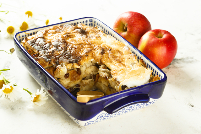 Amesteci laptele cu ouăle bătute și cu extractul de vanilie. Torni totul peste cozonacul și merele din vas și îl introduci în cuptorul încins la 180°C pentru 45 de minute sau până când se rumenește frumos.