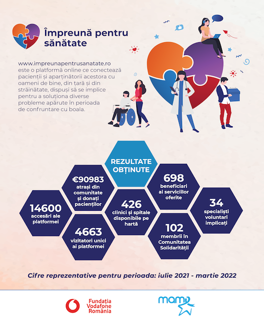 În perioada iulie 2021 – martie 2022, platforma www.impreunapentrusanatate.ro, gestionată de Asociația M.A.M.E în beneficiul pacienților diagnosticați cu cancer sau cu alte afecțiuni grave, a fost accesată de aproape 14.600 de ori și a preluat și rezolvat 428 de cereri de ajutor venite de la bolnavi sau de la aparținătorii lor din întreaga țară. Acestora li se adaugă alte 250 de cazuri – mame și copii, victime ale războiului din Ucraina, care au primit cazare gratuită, sprijin cu traduceri de documente medicale, conectarea cu clinici și spitale, medicamente sau alte bunuri de primă necesitate.