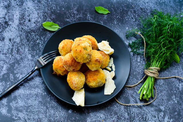 Orezul trebuie să fie rece și tare pentru a putea modela biluțe. Amesteci orezul cu parmezanul ras, dar poți folosi și orez care ți-a rămas în frigider. Tai cașcavalul cubulețe de 1 cm. Pregătești un bol cu apă, pui făina într-o farfurie adâncă, pesmetul amestecat cu boiaua în alta și ouăle le bați într-un castronel.