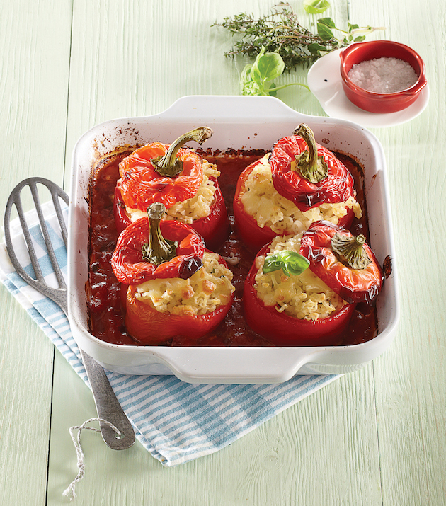 Pui sosul într-un vas mic, așezi deasupra ardeii umpluți, îi acoperi cu capacele și îi introduci în cuptorul încins la 170ºC timp de 40 de minute.