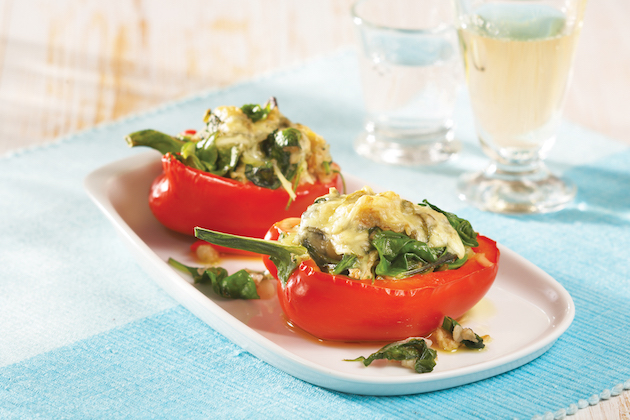 Pui jumătățile de ardei în apă clocotită și le lași până se înmoaie puțin, dar să rămână ferme. Scoți ardeii cu o paletă și îi așezi într-un vas termorezistent uns cu ulei sau unt. Îi umpli cu amestecul de spanac și îi presari cu cașcavalul ras. Îi introduci în cuptorul încins la 180°C până cașcavalul se topește și devine auriu.