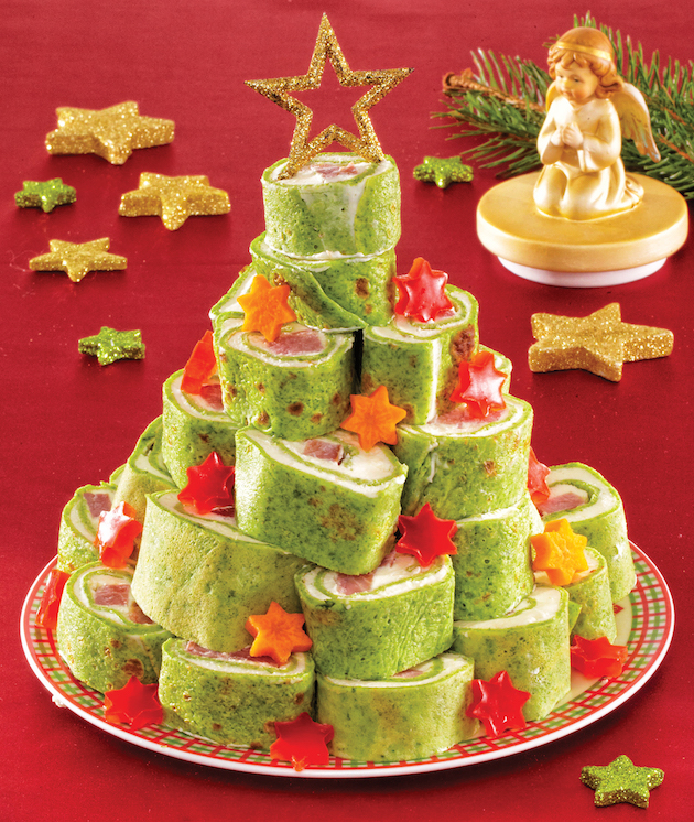 Tai clătitele în felii groase de 1 cm, le așezi pe un platou sub formă de brăduț, pe care îl ornezi cu steluțe din morcov și ardei gras roșu.