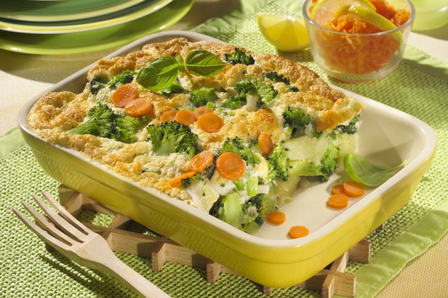 Bați albușurile spumă tare cu un praf de sare, adaugi gălbenușurile treptat, pui legumele și amesteci ușor. Torni compoziția într-un vas mic termorezistent uns cu unt și tapetat cu pesmet. Îl introduci în cuptorul încins la 160°C pentru 30-40 de minute. Decorezi cu morcovul fiert taiat felii si o servesti.