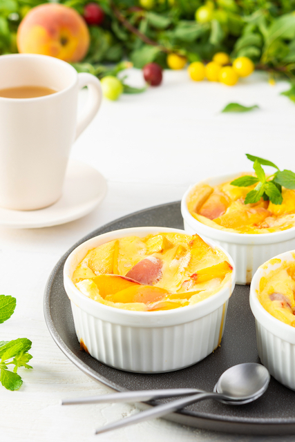 Ungi 3 vase ramekin mici cu unt, împarți compoziția în ele și deasupra pui felii de piersică.