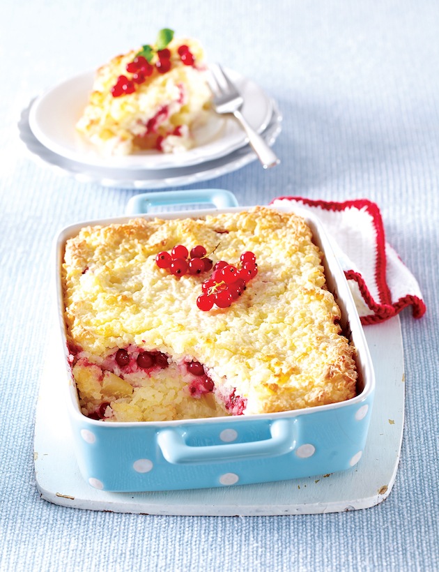 300 g orez cu bobul rotund; 600 ml lapte; 1 praf de sare; 50 g unt; 150 g zahăr pudră; 3 ouă; 1 plic zahăr vanilat; 200 g ananas din compot; 200 g coacăze congelate