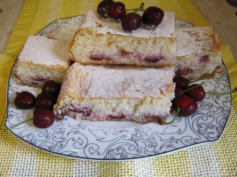 Când orezul este rece, adaugi peste el gălbenușurile, cireșele curățate de sâmburi și amesteci. La final, încorporezi ușor albușurile bătute spumă tare.