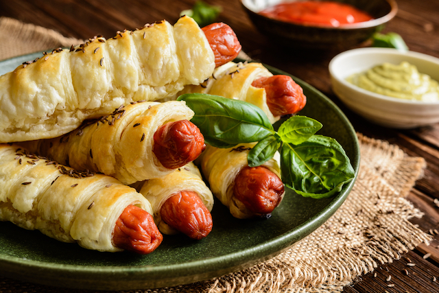 Preîncălzești cuptorul la 180°C. Dezgheți aluatul, îl întinzi puțin cu sucitorul și îl tai în șase fâșii lungi. Le ungi cu muștar și înfășori cârnații cu aceste fâșii începând de la un capăt, petrecând puțin aluatul.
