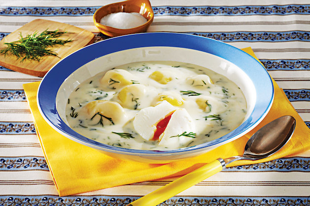 Topeşti untul într-o oală, pui ceapa tocată mărunt, supa de carne şi laşi să fiarbă până când ceapa se înmoaie. Dizolvi făina în laptele rece şi îl torni treptat în supă, amestecând continuu. Laşi să fiarbă, la foc mic, 15 minute din momentul în care dă în clocot.