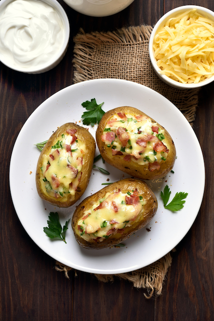 Umpli cartofii cu această compoziție, presari deasupra restul de brânză și pancetta oprită și îi introduci la cuptor pentru 15-20 de minute. Îi servești calzi, cu sos de iaurt!