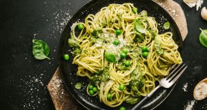 Ingrediente 300 g spaghete 200 g mazăre congelată + 2-3 linguri pentru servit 2 căței usturoi 6 frunze busuioc verde 60 g muguri de pin 60 g parmezan ras + parmezan pentru servit 50 g unt 100 ml ulei de ...