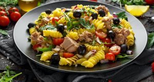 Salata cu paste si ton, măsline negre, roșii cherry dulci și rucola, stropită cu un dressing ușor de lămâie și ulei de măsline – un preparat savuros, plin de culoare și prospețime. Ingrediente 250 g fusilli 150 g măsline fără ...