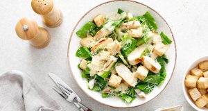Ingrediente 1 salată verde medie 300 g piept de pui 4 felii de pâine 80 g parmezan ras 1 lingură ulei de măsline zeama de la 1 lămâie medie 2 căței mici de usturoi 1 linguriță muștar 125 g iaurt ...