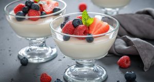 Ingrediente 500 ml smântână dulce; 500 ml lapte; 100 g zahăr pudră; 20 g gelatină; 2 lingurițe esență de vanilie; 400 g fructe de pădure pentru decorMod de preparare Mai întâi, pui gelatina la înmuiat în 50 ml de apă ...