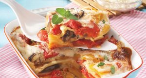 Ingrediente50 g unt; 2 linguri ulei; 100 g făină; 1 l lapte; 400 g ardei gras; 200 g vinete; 200 g dovlecel; 2 linguri ulei de măsline; 400 g foi de lasagna; 400 g roșii tocate din conservă; sare; 100 ...