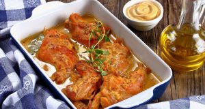 Ingrediente 1 iepure 250 ml vin alb 300 ml smântână de gătit 50 g unt 8 linguri muștar Dijon 2 cepe 1 foaie de dafin 1 crenguță cimbru proaspăt sare piper Mod de preparare Preîncălzești cuptorul la 210°C. Tai iepurele ...