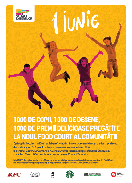 ’’1.000 de copii, 1.000 de desene, 1.000 de premii delicioase la noul Food Court al comunităţii’’ este un eveniment special care va avea loc în data de 1 iunie, între orele 10:00 – 21:00. Primii 1.000 de copii, cu vârsta cuprinsă între 4 – 14 ani, care locuiesc în cartierul Drumul Taberei, sunt invitaţi să vină cu desenul despre locul preferat din cartier și vor fi răsplătiţi cu surprize instant. Pregătim premii delicioase pentru 1.000 de copii care ne învaţă 1.000 de feluri noi de a vedea cartierul Drumul Taberei.