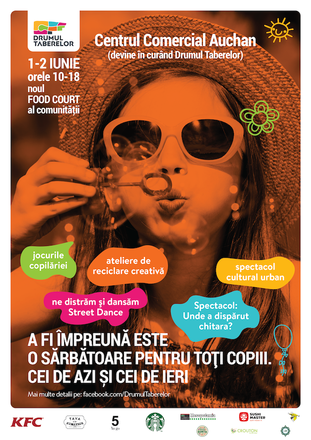 Dacă un copil râde de 300 de ori pe zi, iar un adult de mai puţin de 20 de ori, în 1 iunie nu ar trebui să sărbătorim Ziua Copilului, ci Ziua copiilor de ieri și azi. Vino în 1 iunie la Centrul Comercial Auchan Drumul Taberei, care va deveni în curând Drumul Taberelor, să ne bucurăm împreună desenând pe asfalt, sărind coarda, jucând șotron sau împletind codiţe.