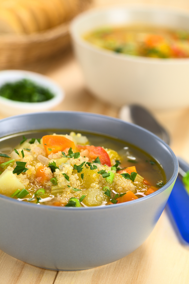 1 ceapă; 2 linguri ulei de măsline; 100 g quinoa; 1 morcov potrivit; 50 g țelină; 1 ardei gras verde; 1/2 legătură leuștean; zeama de la o 1 lămâie mică; 2 cartofi mici; sare