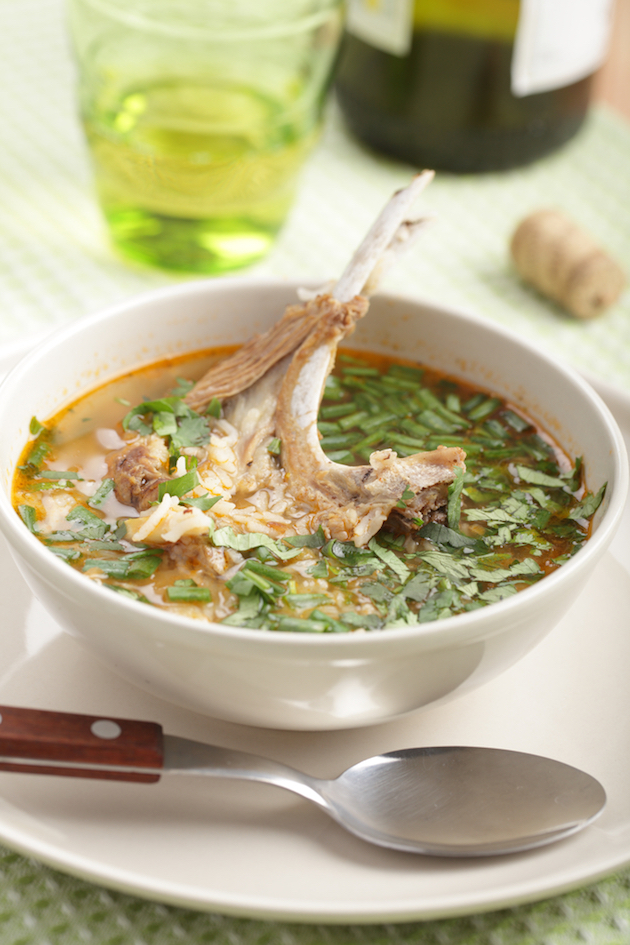 Tai carnea bucățele, o speli și o pui la fiert în apă cât să o acopere. Lași să dea în clocot 5 minute, după care scurgi apa, speli carnea și o pui din nou la fiert în 3 l de apă rece. Când dă în clocot, adaugi legumele și lași până când legumele și carnea sunt aproape fierte. Pui roșiile în bulion cubulețe, orezul și lași să fiarbă până sunt bine pătrunse.