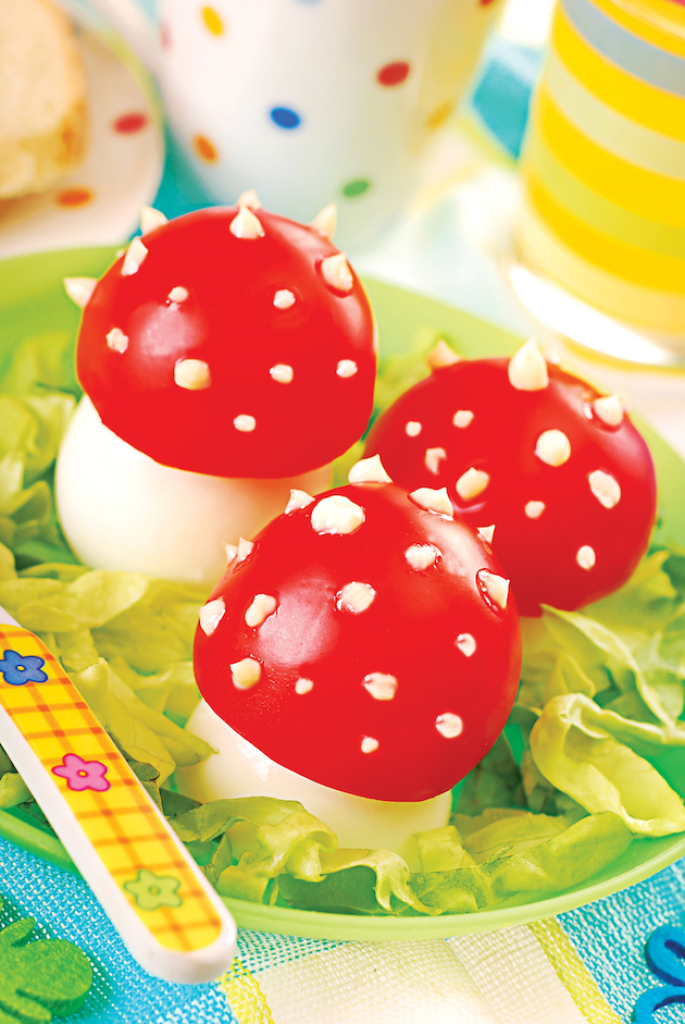 - Umpli ouăle cu amestecul de brânză şi aşezi deasupra căpăcelele de roşii. Faci din brânza rămasă picăţele pe roşii şi le aşezi pe un platou cu salată verde.