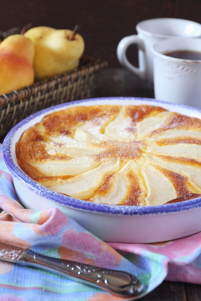 Cureți perele de coajă, le tai sferturi, le cureți de semințe și apoi le tai felii mai groase. Le așezi într-o formă rotundă de 24 cm unsă cu unt sub formă de floare și torni compoziția de lapte. Le așezi una peste alta.