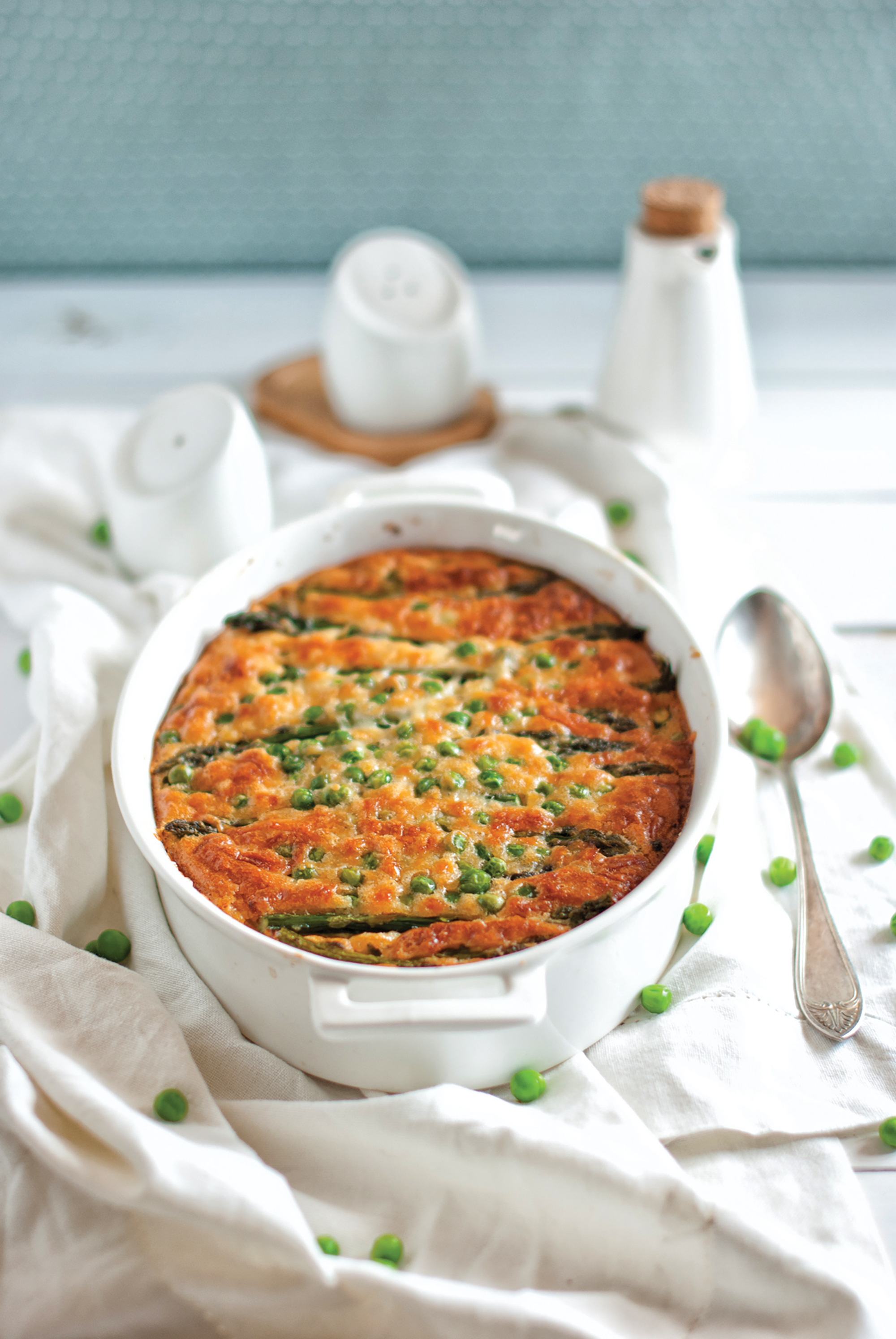 Torni compoziția cu lapte într-un vas termorezistent uns cu unt, așezi deasupra bucățile de sparanghel, mazărea și introduci clafoutisul în cuptorul încălzit la 175ºC până se rumenște frumos, circa 40-45 de minute. Îl lași să se răcorească și îl servești.
