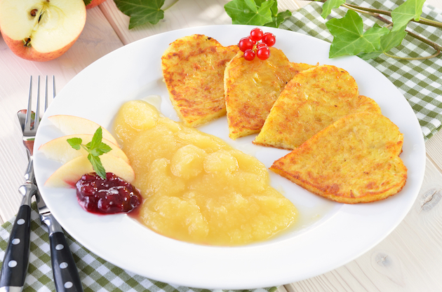 Încălzești untul într-o tigaie, la foc mediu, și pui cu polonicul aluat, formând 4 clătite rotunde sau sub formă de inimioară. Dacă tigaia este mai mică, coci doar două. Lași pe foc până se formează bule deasupra clătitelor, le întorci și le mai lași 30 de secunde. Servești clătitele cu piure de mere.