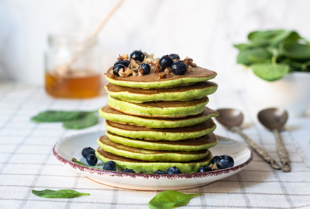 Pui fulgii de ovăz într-un blender și pulsezi, la viteză medie, timp de 30 de secunde. Adaugi spanacul spălat și scurs, banana, oul, laptele, uleiul, scorțișoara și extractul de vanilie și mixați până aluatul este neted. Mai cureți marginile vasului. Adaugi praful de copt, un praf de sare și mai mixezi 20 de secunde.