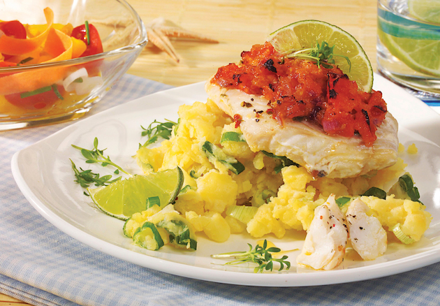 4 fileuri de cod proaspăt (circa 180 g fiecare); sare; 2 roșii mari; 1 ceapă roșie; 4 linguri unt; 3 linguri parmezan ras; 3 linguri pesmet; 4-5 frunze busuioc verde; 600 g cartofi; 1 legătură ceapă verde; 150 ml lapte; 1 vârf de cuțit cu nucșoară; zeama de la ½ lămâie