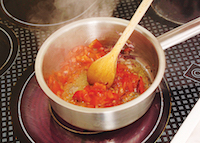 Tai pulpa roșiilor și ceapa cubulețe și le pui într-o tigaie cu jumătate din unt. Lași pe foc 5 minute, după care dai să se răcească.