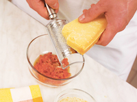 Când roșiile sunt reci, adaugi parmezanul ras, pesmetul și busuiocul tocat, condimentezi cu puțină sare și omogenizezi.