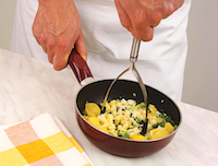 Cureți cartofii de coajă, îi speli, îi tai cuburi și îi fierbi în apă cu un praf de sare. Îi scurgi de apă, pui ceapa verde tocată mărunt, laptele, restul de unt, nucșoara, un praf de sare și îi pasezi. Servești piureul cu peștele la cuptor.