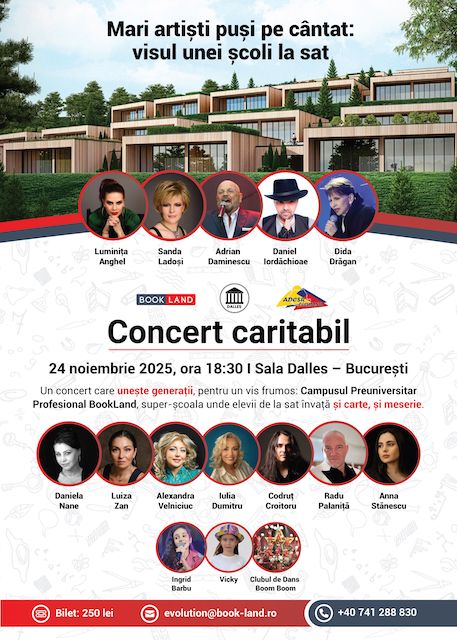 Pe 24 noiembrie, ora 18:30, la Sala Dalles din București, publicul este invitat la concertul caritabil „Mari artiști puși pe cântat: visul unei școli la sat”, dedicat Asociației BookLand și misiunii sale de a oferi copiilor din mediul rural șansa la o educație mai bună. Evenimentul reunește artiști îndrăgiți: Luminița Anghel, Sanda Ladoși, Adrian Daminescu, Daniel Iordăchioae, Dida Drăgan, Luiza Zan, Daniela Nane, Alexandra Velniciuc, Iulia Dumitru, Codruț Croitoru, Radu Palaniță și Anna Stănescu, iar alături de aceștia vor urca pe scenă și tinerii Ingrid Barbu, Vicky și elevii Clubului de Dans Sportiv Boom Boom.