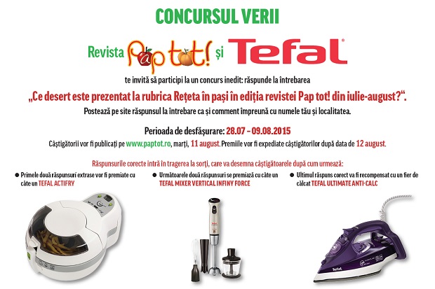 O dată cu zilele toride, vine și dorința ta nestăvilită de a evada din casă, în locurile care-ți amintesc de zilele minunate de vacanță. Dar ce te faci cu treburile casei, cu gătitul, care îți ocupă atât de mult timp? La toate acestea ne-am gândit împreună cu Tefal și, iată, îți propunem câteva ajutoare de nădejde, care aproape că fac lucrurile în locul tău. Participă la concursul nostru și ai șansa de a câștiga aparate Tefal de ultimă generație, care îți ușurează munca în gospodărie.