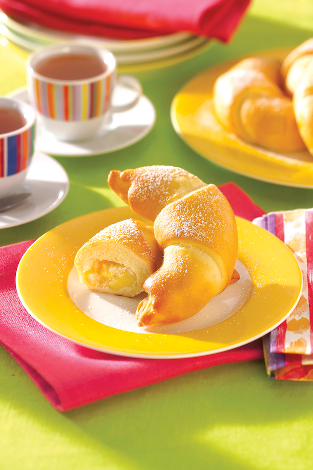 Împarți aluatul în două și întinzi două foi, pe care le tai în câte 6 pătrate. Pui amestec de mere pe colțul fiecărui pătrătat și rulezi cât mai strâns. Le dai forma de cornuleț și le așezi pe o tavă cu hârtie de copt. Le mai lași să crească circa 15 minute, le ungi cu ou bătut și le introduci în cuptorul încins la 190ºC pentru 30 de minute.