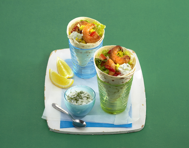 Încălzești tortillla într-o tigaie uscată, împarți amestecul de legume și creveți pe ele și le rulezi sub formă de cornete. Le servești cu sosul tzatziki. Foto: Photoland/Profimedia