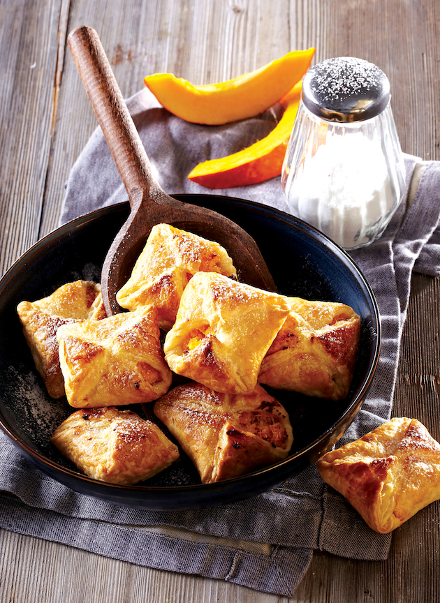 Întinzi foietajul și îl tai în 8 pătrate. Împarți umplutura pe centrul celor 8 pătrate, aduci colțurile pe mijloc și le lipești bine. Ungi pătratele cu ou bătut și le așezi pe o tavă cu hârtie de copt. Le introduci în cuptorul încins la 180°C timp de 30 de minute. Le lași să se răcorească și le presari cu puțin zahăr pudră.
