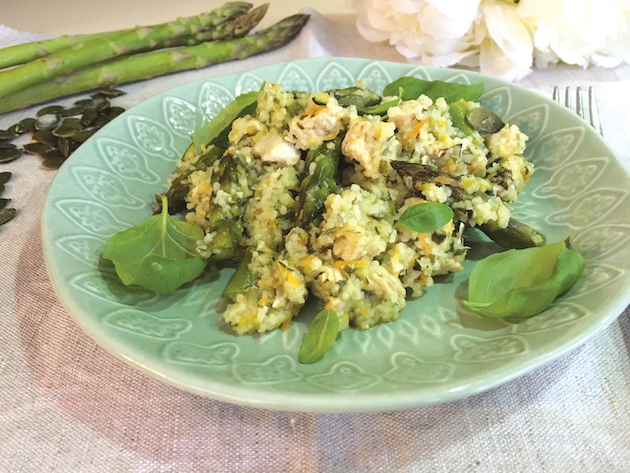 Când carnea e fiartă, adaugi cușcușul și vârfurile tijelor de sparanghel (mai poți adăuga 50-100 ml apă dacă a scăzut prea mult) și mai lași pe foc 4-5 minute. Oprești focul și adaugi pătrunjelul tocat mărunt. Îl servești cald, cu câteva frunzulițe de busuioc și semințe crude de dovleac.