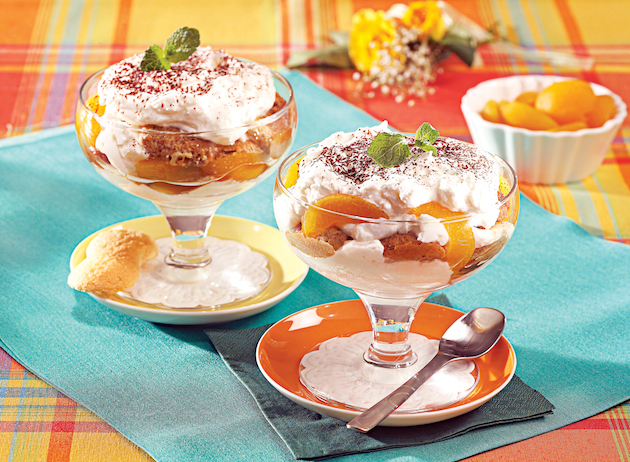 Pui o lingură de cremă pe partea de jos a unei cupe, pui pişcoturi înmuiate în cafea, apoi bucăţi de caise şi acoperi cu cremă. Introduci cupele la frigider pentru cel puțin o oră. Serveşti desertul presărat cu ciocolată rasă.