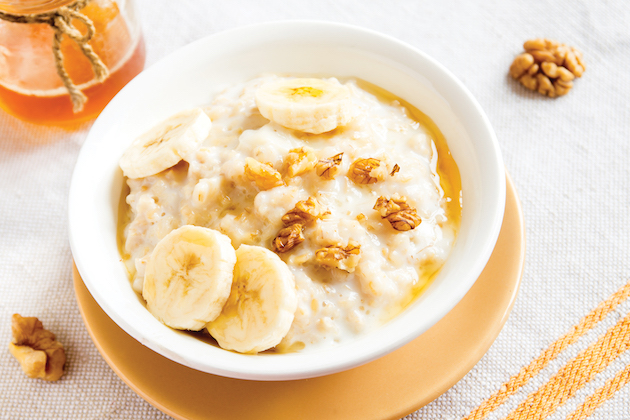 Pui laptele la fiert într-o cratiță și când dă în clocot adaugi orezul spălat în mai multe ape. Lași să fiarbă, la foc mic, până când orezul este fiert. Acoperi cu un capac și lași să se răcorească. Faci un piure din jumătate de banană și îl amesteci în orez.