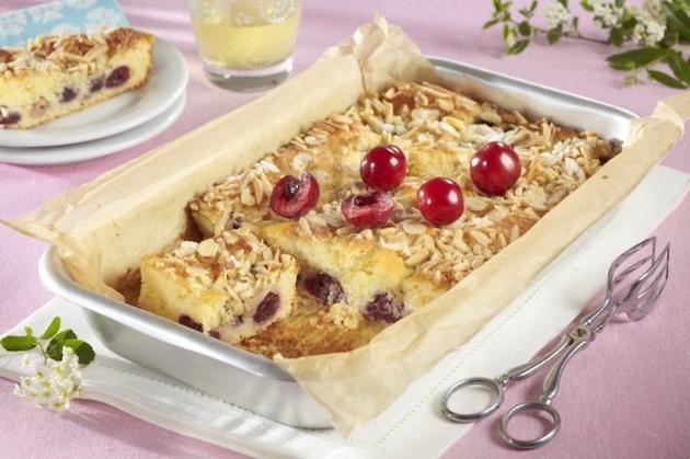 Torni aluatul într-un vas termorezistent mai mic uns şi tapetat şi presari deasupra migdalele tocate. Introduci vasul în cuptorul preîncălzit la 180º C pentru 40 de minute. Serveşti desertul după ce se răceşte.