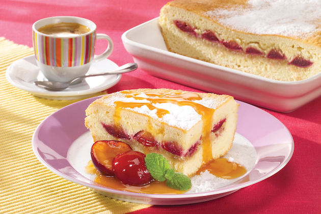 Împarți aluatul în două. Întinzi din prima parte o foaie cât dimensiunea tăvii (24×30 cm) și o așezi în forma căptușită cu hârtie de copt. Presari peste aluat migdalele, zahărul pudră și întinzi cât mai uniform prunele, cu sosul lăsat. Acoperi cu a doua foaie și apeși bine pe margini. Acoperi tava cu prosop și mai lași să crească 10 minute.