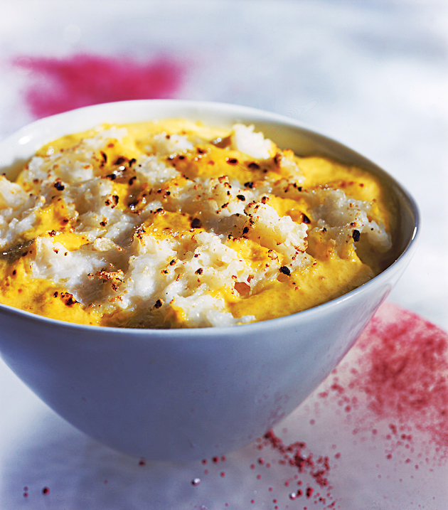 Lași orezul să se răcească, adaugi gălbenușurile, 50 g de unt moale, amesteci și pui compoziția într-un vas termorezistent uns cu unt. Îl așezi în alt vas, torni apă cât înălțimea vasului cu orez și-l introduci în cuptor pentru 20 de minute.