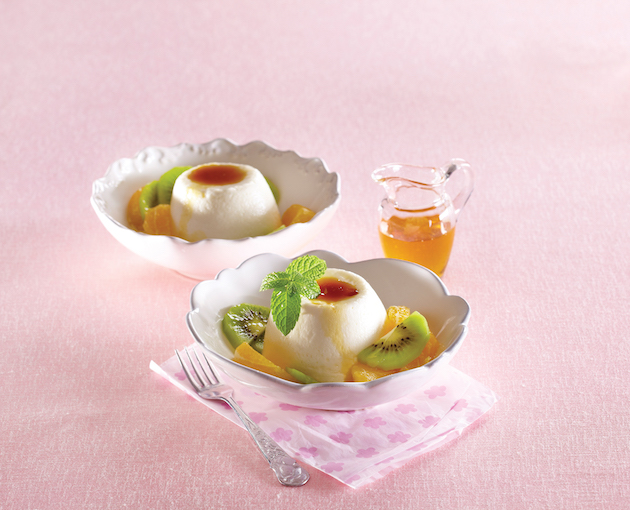 Răstorni deserturile în castronele, torni deasupra câte o lingură de miere şi le serveşti cu portocală şi kiwi tăiate bucăţele sau cu orice alte fructe care iti plac.