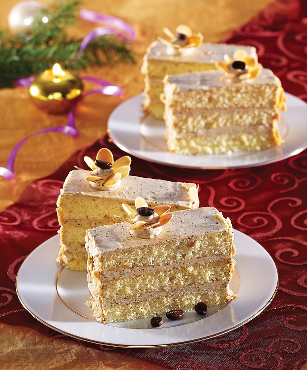 PENTRU BLAT: 3 ouă; 150 g zahăr pudră; 50 g migdale; 200 g făină; 1/2 pliculeț praf de copt. PENTRU CREMĂ: 250 ml cafea cu lapte; 1 plic praf budincă de vanilie; 150 g unt; 80 g zahăr pudră; 2 linguri cafea măcinată foarte fin. PENTRU DECOR: 50 g chipsuri migdale prăjite; boabe de cafea