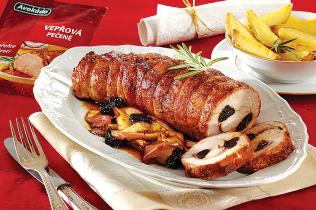 Acoperi carnea cu feliile de bacon, pui prunele din loc în loc și rulezi cât poți de strâns. Legi rulada cu sfoară alimentară, o presari cu sare, piper și cimbru și o așezi într-o tavă.