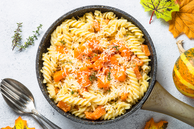 Într-o tigaie mai adâncă topești untul, pui pastele și amesteci. Adaugi cubulețele de dovleac, cimbrul, puțină sare și piper și amesteci. Servești pastele calde, presărate cu parmezan.