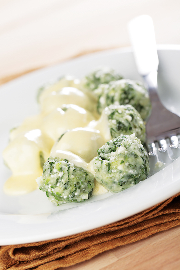 Lași spanacul să se dezghețe într-o strecurătoare. În așa fel se și scurge. Adaugi peste ele usturoiul pisat, urda, grișul și oul. Amesteci până se omogenizează și obții o pastă mai groasă. Dacă este prea moale, mai pui puțin griș.