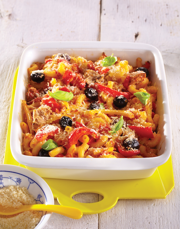 Adaugi peste paste ardeii grași, tonul cu ulei cu tot, usturoiul pisat, roșiile, măslinele și busuiocul tocat mărunt. Amesteci bine și pui compoziția într-un vas uns cu unt și presărat cu pesmet. Presari deasupra parmezanul ras și îl introduci în cuptorul încins la 180°C timp de 40 de minute.
