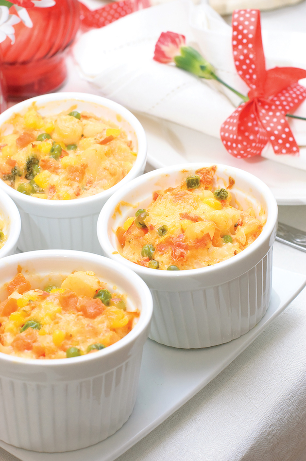 Cureți morcovul, cartoful și păstârnacul, le tai cubulețe și le fierbi pe aburi până se înmoaie. Speli mazărea și o fierbi în apă clocotită până se înmoaie. Împarți apoi legumele fierte  în 3 forme mici de ceramică.